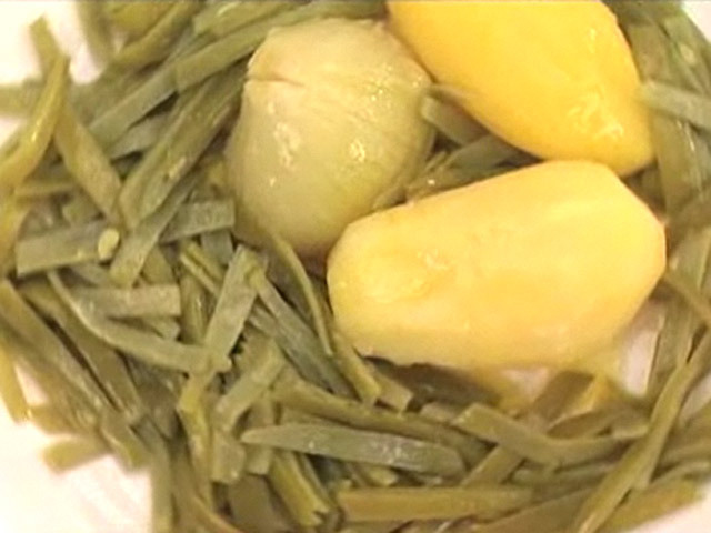 Рецепт испанской кухни.На 2 порции:бобы — 200 гр;картофель — 2 штуки;лук — 1 штука;вода, оливковое масло, соль, малиновый уксус.